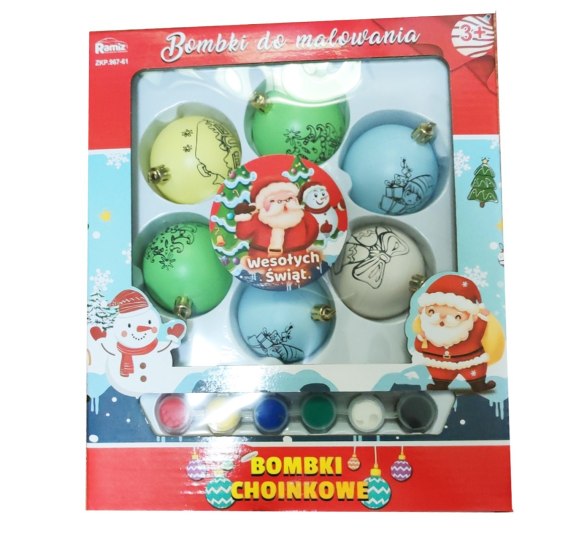 Zestaw 6 bombek do malowania z farbkami dla dzieci powyżej 3-go roku życia. Każda z bombek pokryta jest warstwą, na której umieszczono świąteczny rysunek. Rysunki należy wypełnić kolorami, wedle własnego uznania.