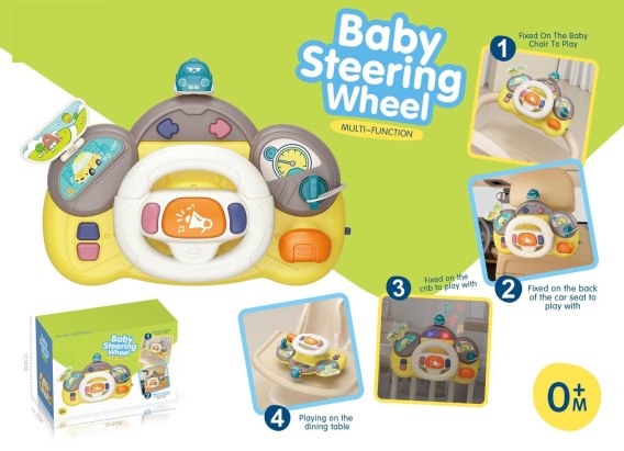 Interaktywna kierownica dla dzieci od pierwszych dni życia. Zabawka wykonana została z najlepszej jakości plastiku w żywych kolorach przyciągających wzrok dziecka. Jest bezpieczna dla maluszków, nie posiada żadnych ostrych krawędzi. Zabawka posiada paski zapinane na rzepy, które można przymocować do wózka, łóżeczka, siedzenia samochodu czy krzesełka do karmienia. Zabawka zasilana jest bateriami typu 3 x AA 1,5 V (brak w zestawie). Funkcje zabawki: - odpowiednia dla maluszków od pierwszych dni życia, - wykonana z najlepszej jakości materiałów, - żywe kolory przyciągają wzrok dziecka, - posiada efekty dźwiękowe: klakson, melodyjki, alarmy, odgłosy jazdy, odgłosy wydawane przez kierunkowskazy, odgłosy odpalania silnika, - posiada efekty świetlne: klakson, kierunkowskazy, - ruchome elementy: kierownica, skrzynia biegów, autko na górze kierownicy, przekręcany kluczyk, otwierana książeczka, - można ją umocować na łóżeczku, wózku, krzesełku do karmienia |