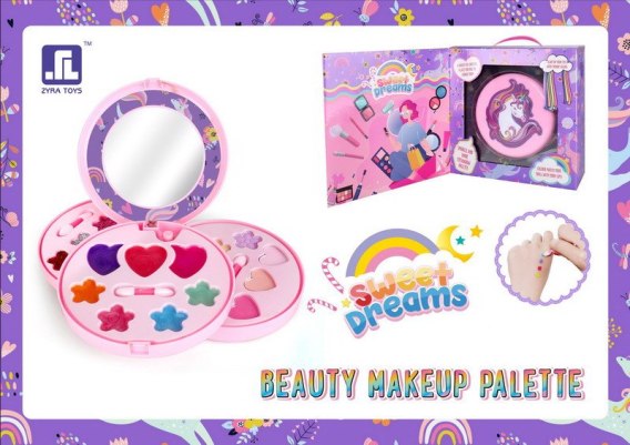 - szkatułka z kosmetykami, złożona ok. 5,5 cm x 12 cm średnicy, rozłożona ok. 13 cm x 20 cm, - dwustronne patyczki do cieni do powiek i pomadek ok. 4 cm długości, - mniejsze serduszka z cieniami do powiek i pomadkami do ust ok. 2,5 cm x 2,5 cm, - większe serduszka z cieniami do powiek i pomadkami do ust ok. 3,5 cm x 3,5 cm, - gwiazdki z pomadkami do ust z brokatem ok. 2,5 cm x 2,5 cm, - lusterko ok. 7,5 cm średnicy, - opakowanie ok. 19,5 cm x 19 cm x 8 cm. |
