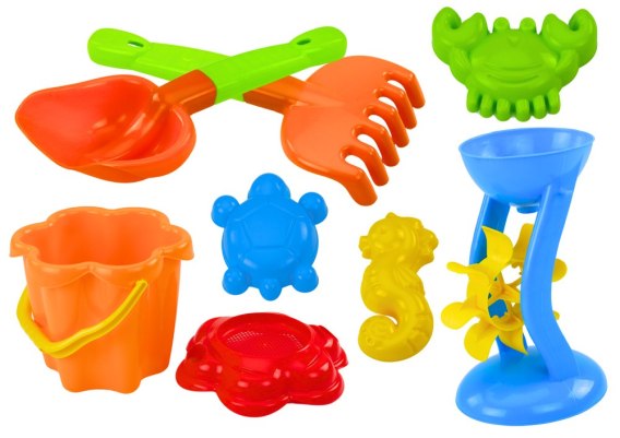 Zestaw do piasku 9 elementów zawiera wiaderko z przykrywką-sitkiem, młynek, łopatkę, grabki oraz cztery foremki w kształcie konika wodnego, rozgwiazdy, żółwia i kraba. To idealny komplet do zabawy na plaży lub w piaskownicy.