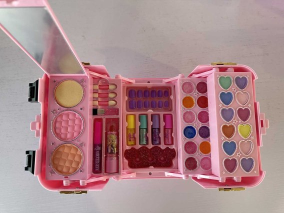 Wspaniały zestaw do robienia makijażu z kuferkiem dla dzieci od 3- go roku życia. Kuferek posiada rączkę do przenoszenia, zapinany jest na zatrzask. W środku kryje mnóstwo różnych błyszczyków, cieni, pomadek, sztucznych paznokci oraz lusterko. Wszystkie kosmetyki wykonane zostały z bezpiecznych dla dziecka materiałów i łatwo się je zmywa.
