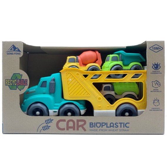 Zestaw pojazdów, wykonany z bioplastiku dla dzieci od 18-go miesiąca życia. Zestaw składa się z dużej lawety, z ruchomą platformą i autek. Eko-tworzywo jest bezpieczne dla dzieci i przyjazne dla środowiska. Pojazdy są kolorowe, wytrzymałe i odporne na uszkodzenia, posiadają ruchome elementy. W betoniarce możemy manualnie obracać gruszkę do betonu, w wywrotce, podnosić i opuszczać przyczepkę a w śmieciarce otwierać tylną klapę pojazdu. Maluszek może również manualnie przesuwać pojazd po podłożu, dzięki ruchomym kółeczkom.