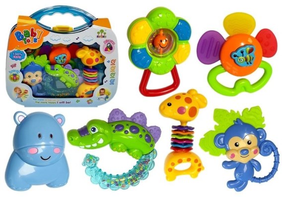 Grzechotki są to jedne z najlepszych nauczycieli dla małych odkrywców. Rozwija jedne z podstawowych umiejętności takich jak: rozpoznawanie dźwięków i kształtów, koordynacja ręka - oko, poprawi zmysł wzroku i słuchu. Zabawki przyciągają także swoimi wesołymi kształtami i barwną kolorystyką. Na pewno twój maluch wybierze spośród 6 grzechotek jedną z ulubionych. Do wyboru mamy krokodyla, małpkę, żyrafę, kwiatuszek, hipopotam lub pszczółkę. Każde ma przyjazną buzie, dzięki czemu twoje dziecko nie wystraszy się wręcz przeciwnie sprawi mu to radość. Niektóre z grzechotek posiadają gumowe dodatki, które służą jak gryzak przydatne przy ząbkowaniu u dziecka. Zabawki zapakowane są w przezroczystej walizce.