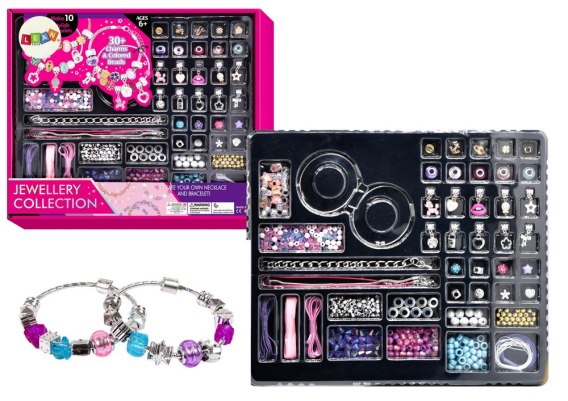 Zestaw do tworzenia biżuterii dla dziewczynek. Zawiera bransoletki, przywieszki, koraliki i sznureczki. Pozwala na projektowanie oryginalnych ozdób, stymulując kreatywność i wyobraźnię dziecka. Estetyczne opakowanie z okienkiem. Idealny prezent!