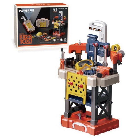 Bogato wyposażony zestaw narzędzi 3 w 1 dla małych majsterkowiczów od 3-go roku życia. Z zestawu możemy zbudować stolik warsztatowy a po skończonej zabawie przekształcić go w walizkę na narzędzia dołączone do zestawu. Możemy zbudować walizkę z rączką do przenoszenia lub walizkę na kółkach do pchania. Zestaw zawiera 78 elementów takich jak części składowe warsztatu, kask, piła, śrubokręty, wiertarko-wkrętarkę na baterie, dużą ilość śrubek itp. Wkrętarka zasilana jest bateriami typu 2 x 1,5V AA, brak baterii w zestawie. Wkrętarko-wiertarka działa jak prawdziwa, wkręca, wykręca, a podczas pracy świeci się czerwona dioda na przodzie zabawki. |