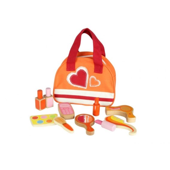 Uroczy zestaw drewnianych rekwizytów, dzięki którym dziewczynka będzie mogła udawać, że stylizuje włosy i paznokcie, oraz maluje twarz. Swoje kosmetyki będzie mogła zabrać ze sobą wszędzie, a to dzięki materiałowej torbie, która znajduje się w zestawie.