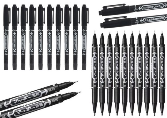Zestaw 10 czarnych markerów dwustronnych (0.5 mm i 1.0 mm), wodoodpornych i trwałych. Idealne do oznaczania medycznego, etykietowania, prac rękodzielniczych i pisania na różnych powierzchniach. Niezbędne w domu, biurze, aucie i apteczce.