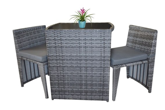 Ten elegancki zestaw mebli w czarnym kolorze został wykonany z wysokiej jakości rattanu syntetycznego - materiału odpornego na szkodliwe działanie warunków atmosferycznych. Zestaw składa się z 2 krzeseł oraz stolika kawowego ze szklanym, czarnym blatem. Ze względu na swoje niewielkie wymiary nasze meble idealnie się sprawdzą na balkonie, tarasie czy ogrodzie. Dodatkową zaletą mebli jest ich kompaktowy wymiar. Krzesła można wsunąć pod stolik przez co cały zestaw zajmuje niewiele miejsca. Krzesła posiadają poduszki w kontrastowym kolorze dla większego komfortu podczas użytkowania.