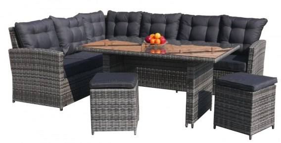 • Zestaw Mebli ogrodowych 4w1 Techorattan Szary + Narożnik + Stół + 2 Pufy + 15 Poduszek