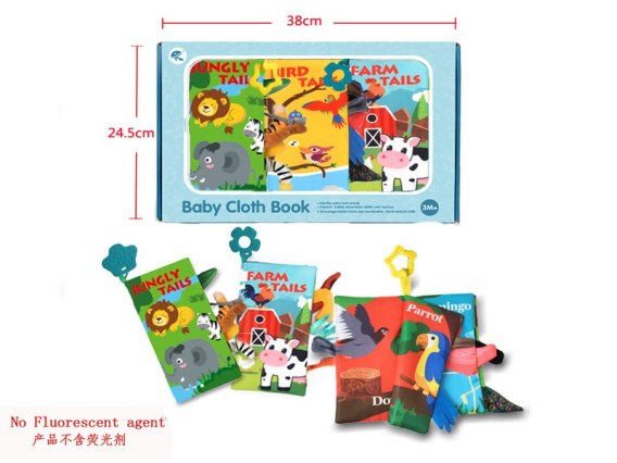 Zestaw miękkich książeczek sensorycznych dla maluszka od trzeciego miesiąca życia. Zestaw wykonany został z najlepszej jakości materiałów bezpiecznych dla maluszków. Szeleszczące, piszczące i miękkie w dotyku strony stymulują zmysły maluszka na wielu płaszczyznach. Żywe kolory przyciągają wzrok dziecka i zachęcają do edukacyjnej zabawy. Na miękkich kartkach znajdują się rysunki wielu zwierzątek. Pierwsza książeczka przedstawia zwierzątka safari, druga zwierzątka na farmie, a trzecia różne ptaki. Każde zwierzątko jest podpisane w języku angielskim. Z każdej ze stron wystają ogonki, dodatkowo do każdej książki doczepiono gryzak. Książeczki są wodoodporne i łatwo się je czyści.