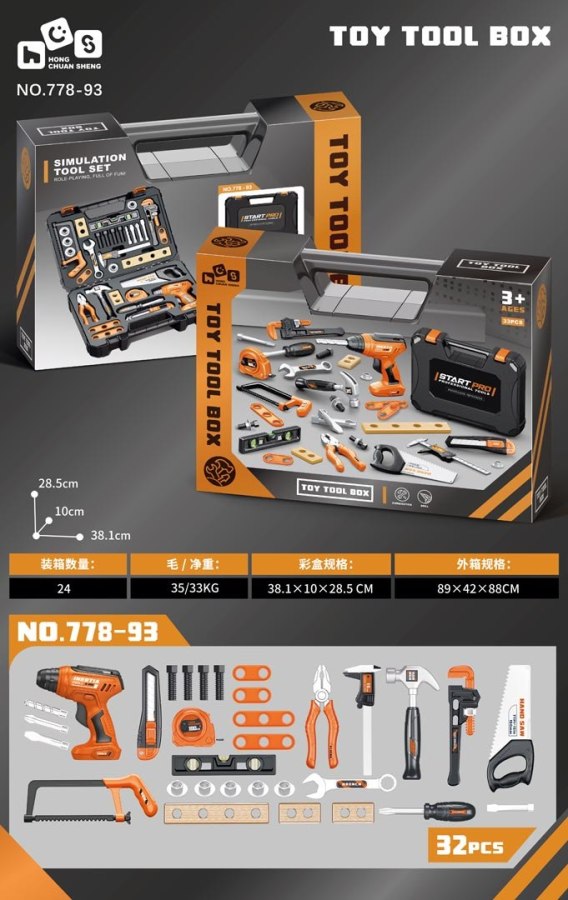 Bogato wyposażony zestaw narzędzi z interaktywną wiertarko-wkrętarką oraz skrzynką narzędziową dla dzieci powyżej trzeciego roku życia. Zestaw wykonany został z najlepszej jakości plastiku i posiada aż 34 elementy. Prócz dużej skrzynki na narzędzia, wyglądającej profesjonalnie w zestawie mamy też: wiertarko-wkrętarkę z wymiennymi bitami, suwmiarkę, klucz do śrub, metr, śrubokręt, młotek, piłę ręczną, kombinerki, oraz wiele śrubek, nakładek, drewienek do wkręcania.