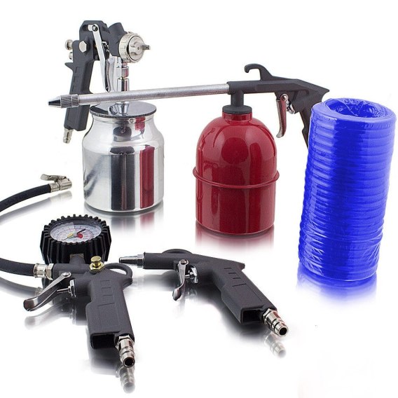 Komplet narzędzi do kompresora to idealny zestaw do malowania, lakierowania, przedmuchiwania i pompowania. To niezbędnik w Twoim domu i warsztacie. Każdy element zakończony jest szybkozłączem, co ułatwi dopasowanie końcówek.