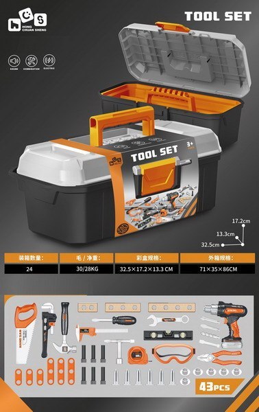 - skrzynka na narzędzia ok. 32 cm x 17 cm x 14 cm, - wiertarko-wkrętarka ok. 14,5 cm x 16 cm x 5 cm, - wymienne bity do wiertarki ok. 6,5 cm długości, - kombinerki ok. 15 cm x 5 cm x 1,5 cm, - okulary ochronne ok. 14 cm x 6,5 cm x 4 cm, - klucz oczkowo-płaski ok. 14 cm x 4 cm, - nasadka do śrubokręta ok. 8 cm x 3,5 cm, - wymienne bity do śrubokręta ok. 7,5 cm długości, - klucz do śrub ok. 11 cm x 9 cm, - młotek ok.17 cm x 8 cm, - suwmiarka ok. 17 cm x 4,5 cm, - metr ok. 5,5 cm x 6 cm, - piłka ręczna ok. 19,5 cm x 8 cm, - poziomica ok. 16,5 cm x 3,5 cm. |