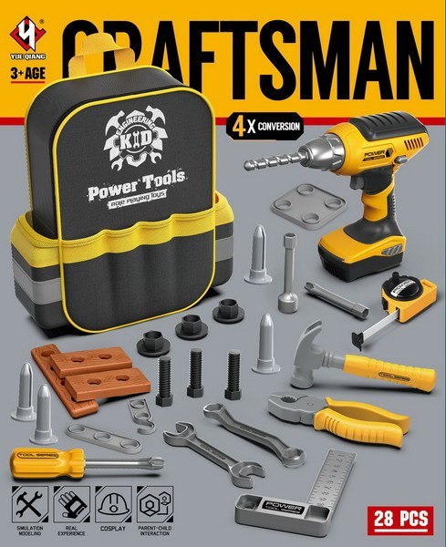 Bogato wyposażony zestaw narzędzi z plecakiem na narzędzia i interaktywną wiertarko-wkrętarką dla dzieci od 3-go roku życia. Zestaw wykonano z najlepszej jakości plastiku. Plecak na narzędzia posiada główną komorę zamykaną na zamek błyskawiczny, małe kieszonki po bokach oraz przeszycia, które pomieszczą narzędzia. Wiertarko-wkrętarka zasilana jest bateriami typu 3 x AAA 1,5V (brak w zestawie) wkręca i wykręca, dodatkowo posiada wyjmowany akumulator jak w prawdziwej wiertarce, wymienne bity i świeci podczas pracy. W zestawie znajduje się, aż 28 elementów, prócz plecaka i wiertarko-wkrętarki mamy także: metr, młotek, kombinerki, kluczek, kątownik, śrubki, kołki, elementy do wkręcania.