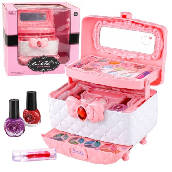 Zestaw został zaprojektowany w formie praktycznego, wielopoziomowego kuferka, który umożliwia wygodne przechowywanie wszystkich elementów. Po otwarciu dziecko ma dostęp do licznych kosmetyków i akcesoriów, takich jak cienie do powiek, błyszczyki czy pomadki. Dodatkowo zestaw zawiera elementy do stylizacji paznokci, takie jak lakiery, tipsy oraz separatory, co pozwala na jeszcze bardziej realistyczną i rozbudowaną zabawę.