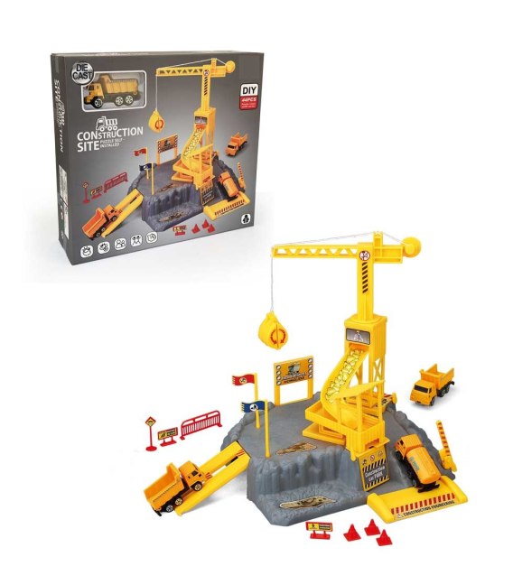 - dźwig z placem budowy, - autko budowlane, - szlaban, - barierki - 6 x pachołek, - flagi, - znaki. |
