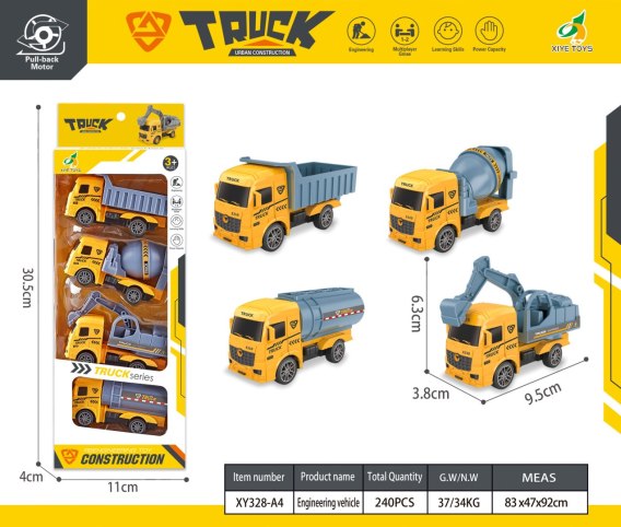 Zestaw 4 pojazdów budowlanych z ruchomymi elementami dla dzieci od trzeciego roku życia. Zestaw wykonany został z najwyższej jakości materiałów z dbałością o szczegóły. Niewielki gabaryt pojazdów pozwala je zabrać wszędzie ze sobą. W zestawie znajduje się betoniarka, wywrotka, koparko-ładowarka oraz cysterna.