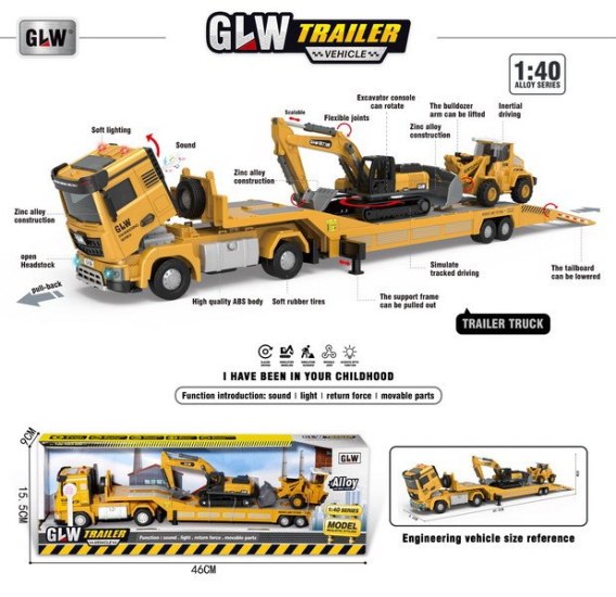 Interaktywny zestaw pojazdów budowlanych z lawetą dla dzieci od 3-go roku życia. Zestaw wykonany został z najlepszej jakości materiałów, metal łączony z plastikiem. Tir budowlany posiada efekty dźwiękowe i świetlne takie jak dźwięk odpalanego pojazdu, cofania, klaksonu, migające światła z przodu oraz na dachu ciężarówki. Wszystkie efekty uruchamiają się po naciśnięciu na pojazd. Karoseria pojazdu jest metalowa, a wszystkie pozostałe jej elementy są plastikowe. Koparka i spychacz posiadają metalowe łyżki, oraz ruchome elementy takie jak łyżka, ramię, gąsienice. Tir budowlany posiada opuszczaną kabinę do przodu oraz napęd pull-back i gumowe opony, zapewniające mu lepszą przyczepność do podłoża. Lawetę możemy odpiąć od ciężarówki. Tył lawety otwiera się, aby zapewnić lepszy rozładunek pojazdów budowlanych. Zabawka zasilana jest bateriami typu 3 x AG13 (w zestawie). Funkcje zestawu: - przeznaczony dla dzieci od 3-go roku życia, - skala odwzorowania z oryginałem 1:40, - wiele możliwości zabawy, - solidne wykonanie: metal łączony z plastikiem. Metalowa kabina tira, metalowe łyżki koparki i spychacza, - ruchome elementy: kabina tira odchylana w przód, otwierana tylna klapa lawety, ruchoma łyżka i ramię spychacza, ruchoma łyżka i ramię koparki, kabina w koparce obraca się o 360 stopni, - napęd pull-back, - gumowe opony, - efekty dźwiękowe: odgłosy odpalanego pojazdu, cofania, klaksonu, - efekty świetlne: świecące światła z przodu oraz migający kogut na dachu tira, - odpinana laweta. |
