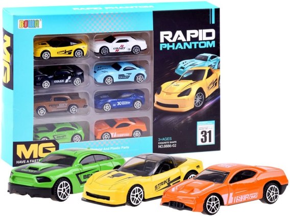 Zestaw metalowych samochodów na plastikowym podwoziu, zapewne przyda się w niejednym garażu małego kolekcjonera pojazdów. Autka wykonane bardzo starannie i efektownie przykują uwagę podczas niejednego wyścigu. W zestawie znajdują się samochody osobowe w przeróżnych kolorach i stylach, dla każdego coś dobrego.