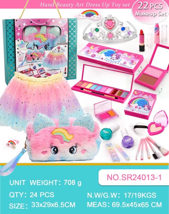 - spódniczka na gumce, - torebka z jednorożcem, - korona, - paleta z lusterkiem, siedmioma cieniami i trzema brokatowymi błyszczykami oraz dwustronnym pędzelkiem, - 2 x szminka, - paletka z lusterkiem i dwoma cieniami, - paletka z dwoma błyszczykami, - okrągłe serduszko z cieniami, - 2 x lakier do paznokci, - gąbka do zmywania makijażu, - separator do palców, - 2 x pilnik do paznokci, - pierścionek, - zestaw czterech pędzelków do makijażu i grzebyk dwustronny, - kolorowe opakowanie, idealne na prezent. |