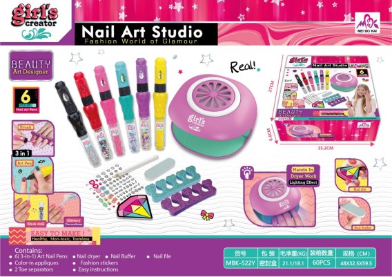 Bogato wyposażony, bezpieczny zestaw do paznokci z akcesoriami to propozycja dla dzieci od 6-go roku życia. Zestaw zawiera działającą na baterie suszarkę do paznokci, która posiada delikatny nawiew powietrza oraz podświetlenie środka na niebiesko. Suszarka zasilana jest bateriami typu 2 x AA 1,5 V. Prócz suszarki w zestawie znaleźć możemy również 6 pisaków do paznokci. Każdy z pisaków pełni trzy funkcje. Maluje paznokcie (końcówka z pędzelkiem), rysuje na paznokciach (końcówka z igłą) i zdobi (różowy pisak -różowy brokat, żółty pisak - żółty brokat, czarny pisak - srebrny brokat, czerwony pisak - diamenciki na paznokcie, zielony pisak - kolorowe gwiazdki, fioletowy pisak - diamenciki na paznokcie). Ponadto do zestawu dołączono również pilniczki do paznokci, separatory do palców, białą kredkę i aplikacje na paznokcie. Każdy z elementów zestawu jest bezpieczny dla dziecka i nietoksyczny. Funkcje zestawu: - suszarka do paznokci z efektami dźwięku i światła, - pisak 3 w 1 (końcówka z pędzelkiem, z igłą z aplikacjami do paznokci). |