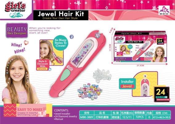 - maszynka do aplikacji biżuterii na włosach - 24 sztuki biżuterii w różnych kolorach i rozmiarach, - 25 sztuk spinek, - instrukcja |