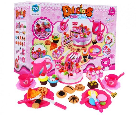 | - 6 kawałków tortu, - 7 świeczek w tym jedna większa, świecąca (ok. 6,5 cm x 2 cm - świeczka duża, 4,5 x 0.5 cm - świeczka mała), - 12 bez (ok. 2 cm x 2 cm), - 5 wisienek (ok. 4,5 cm x 2,5 cm), - miś (ok. 6,5 cm x 4,5 cm), - 4 kiwi (ok. 2,5 cm x 2,5 cm), - 5 truskawek (ok. 2,5 cm x 2,5 cm), - 5 mandarynek (ok. 2,5 cm x 2 cm), - 5 pałeczek lukrowych (ok. 2,5 cm x 2,5 cm), - 2 babeczki (ok. 5 cm x 6 cm), - 11 różnych ciasteczek (różne kształty, wymiary ok. 6 cm x 5 cm), - 3 kawałki rolady, - 2 nożyki mniejsze (ok. 11 cm x 2 cm), - nożyk duży (14 cm x 3 cm), - zestaw kolorowych naklejek, - 4 talerzyki (małe ok. 10 cm średnica, duże ok. 14 cm średnica), - 2 kubeczki (ok. 5 cm x 8 cm), - 2 widelce (ok. 10 cm x 2,5 cm), - 2 łyżeczki (ok. 10 cm x 2,5 cm), - czajnik (ok. 10 cm x 12 cm), - gwizdek. |