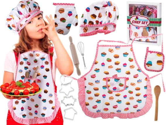 W zestawie znajdują się akcesoria - fartuch, rękawica kuchenna, czapka i podkładka pod gorące naczynia - w kolorowe babeczki, które zdecydowanie mogą narobić apetytu. A sama czapka pozwoli poczuć się jak prawdziwy szef kuchni.