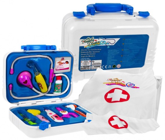 Bogate, 10-cio elementowe, wyposażenie daje nieograniczone możliwości w leczeniu małych pacjentów, a zabawę uatrakcyjnia fartuszek lekarski.
