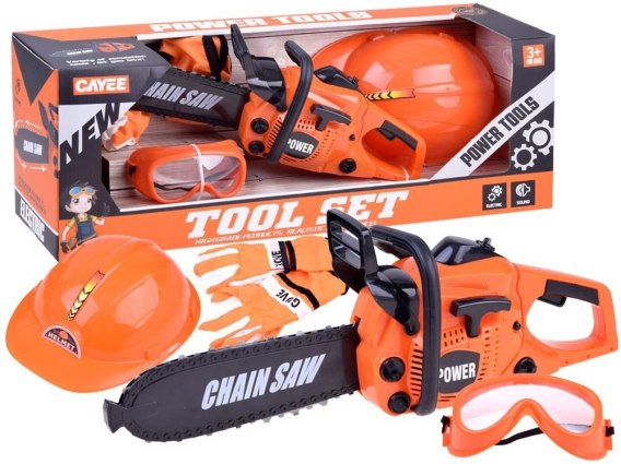 Zestaw małego drwala z piłą i akcesoriami ochronnymi. Piła, kask, okulary, rękawice.