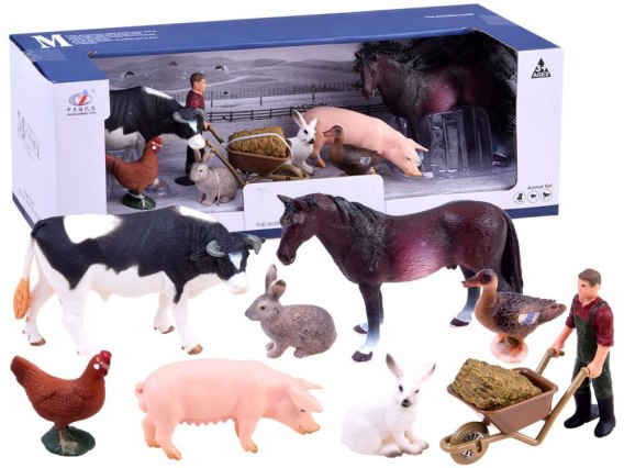 Zestaw zawiera m.in. świnkę, krówkę, konia, zajączka i inne. Niczym w prawdziwej zagrodzie nad całością czuwa figurka farmera.
