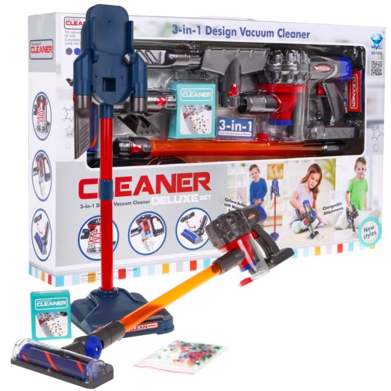 Odkurzacz 3w1 z efektami dźwiękowymi  to zabawka dla dzieci powyżej trzeciego roku życia. Uczy dziecko utrzymywać porządek we własnym pokoju. Zabawka ta jest wyjątkowo udaną kopią prawdziwego odkurzacza pionowego. Łatwo i szybko możemy ją przekształcić w mały ręczny odkurzacz. Urządzenie wydaje odgłosy ssania oraz wciąga dołączone do zestawu kuleczki styropianowe, które dodatkowo po wciągnięciu do zbiornika wirują. Zabawka zasilana jest bateriami typu 3 x AA 1,5V (brak w zestawie).