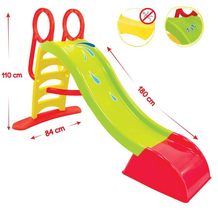 Polska zjeżdżalnia dla dzieci z natryskiem i łagodnym zjazdem Dzięki swej konstrukcji i bardzo łatwemu montażowi zjeżdżalnię można zabrać ze sobą na wczasy, wycieczkę czy wizytę u babci. Szeroki ślizg i solidne podparcie zapewniają stabilność zjeżdżalni. Opcjonalnie można podłączyć natrysk wody do na zjazd, podłączenie wody za pomocą węża ogrodowego od dołu zjeżdżalni. Zjeżdżalnia posiada antypoślizgowe stopnie z podstawą gwarantujące bezpieczeństwo podczas wchodzenia, nie mniej jednak zabawa powinna odbywać się pod nadzorem osoby dorosłej.