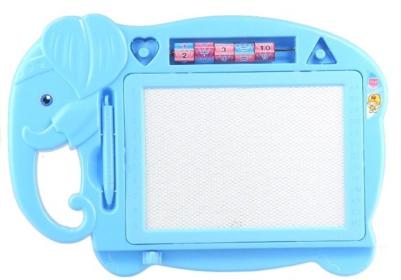 Dziecięcy znikopis składa się z ekranu, na którym można swobodnie rysować i pisać, magnetycznego długopisu, dwóch stempelków - w kształcie serca i trójkąta, liczydła oraz suwaka służącego do zmazywania obrazków. Całość umieszczona jest w błękitnej ramie o sylwetce słonia, którego trąba jest rączką, bardzo przydatną podczas przenoszenia tablicy. Obramowanie ekranu ozdobione jest liczbami, alfabetem i ruchomym liczydłem. Połączenie to pozwoli na łatwą próbę pisania cyfr i literek, bez konieczności korzystania z dodatkowych materiałów.